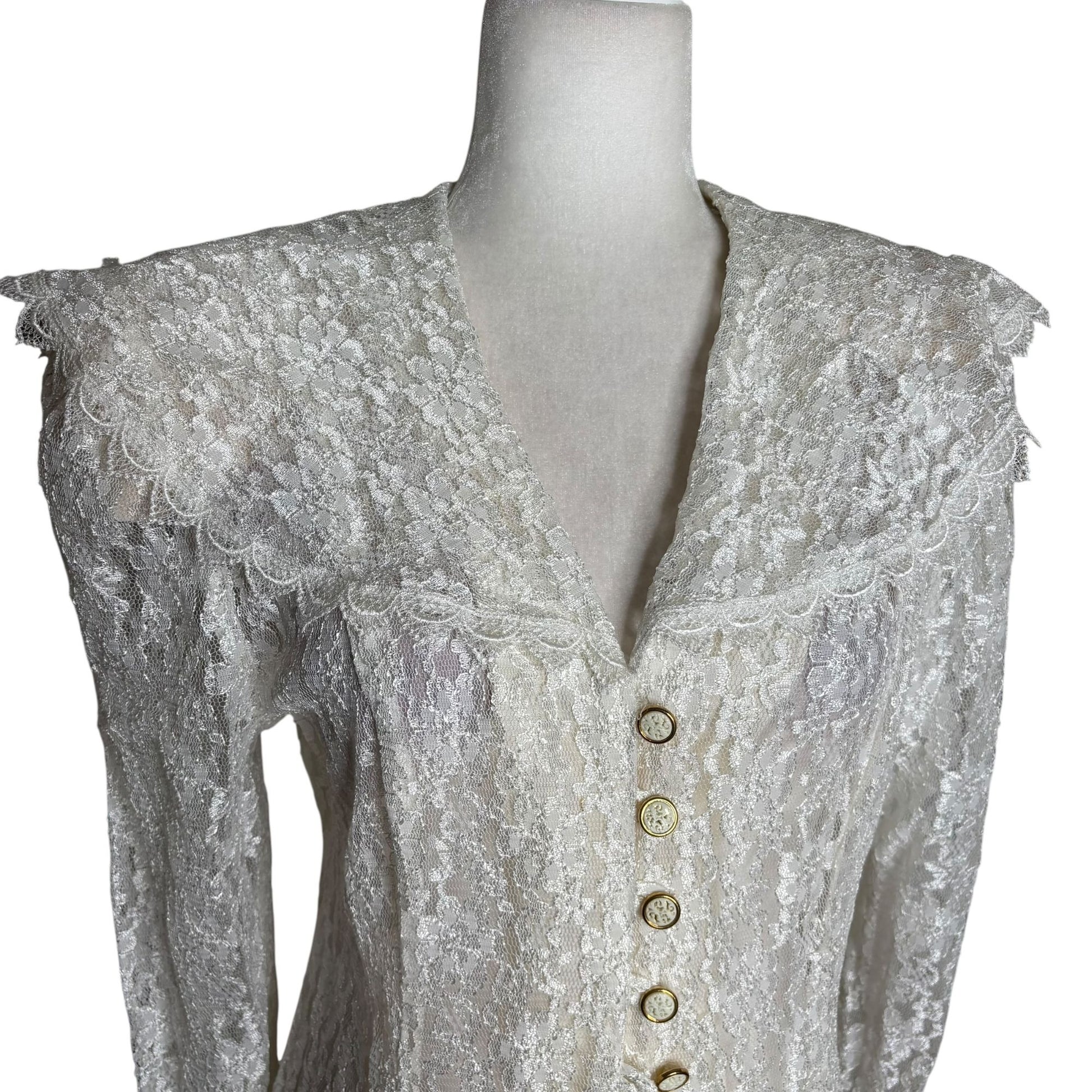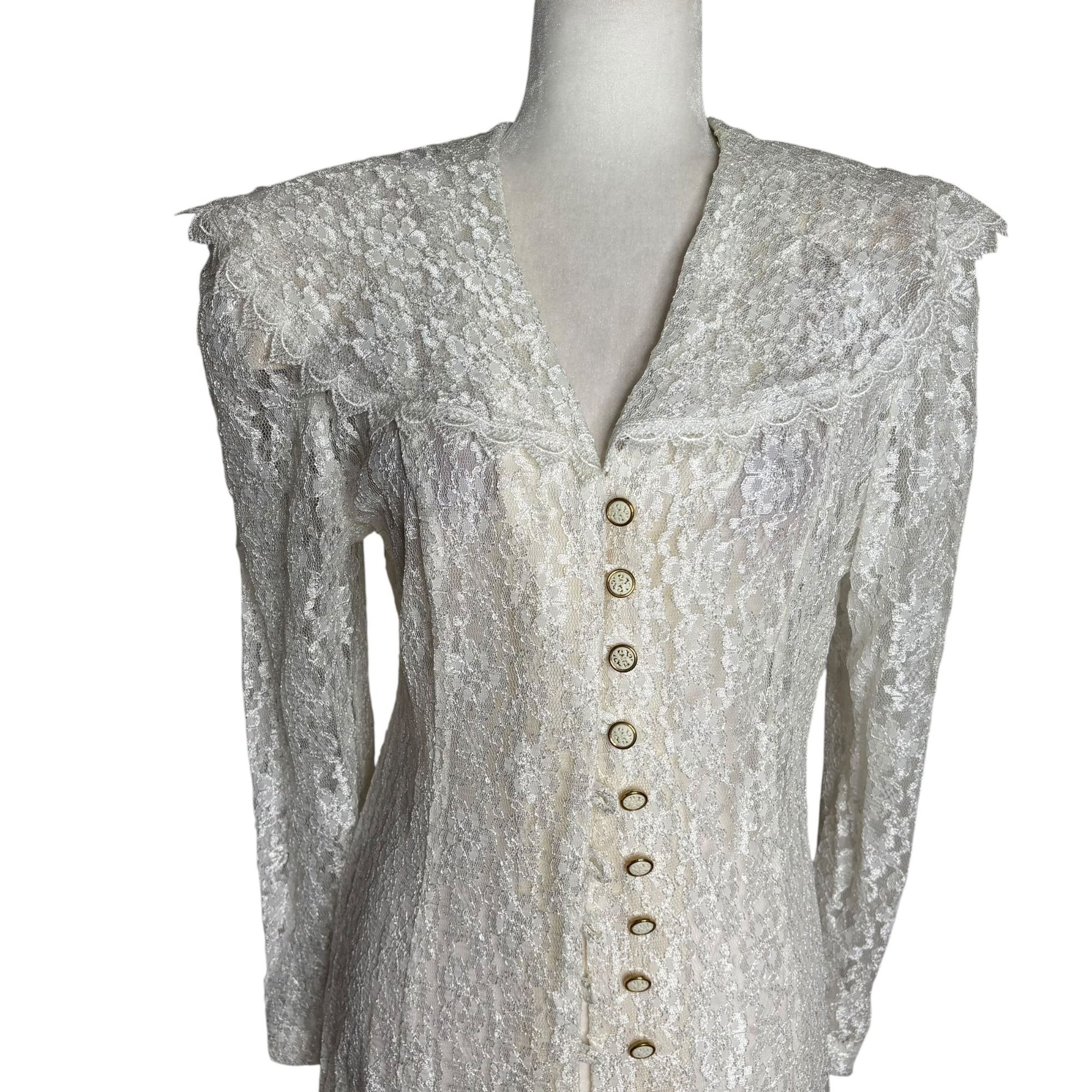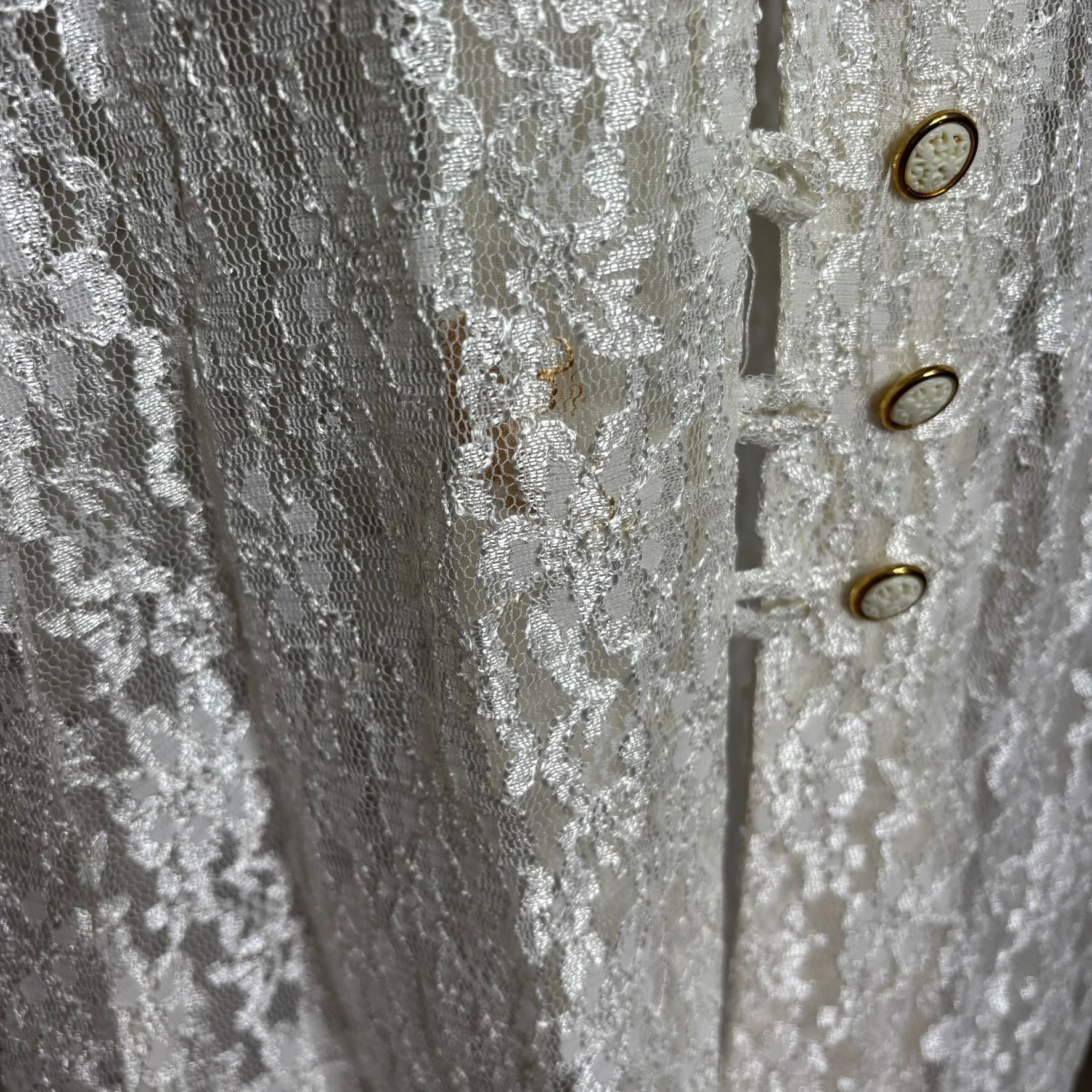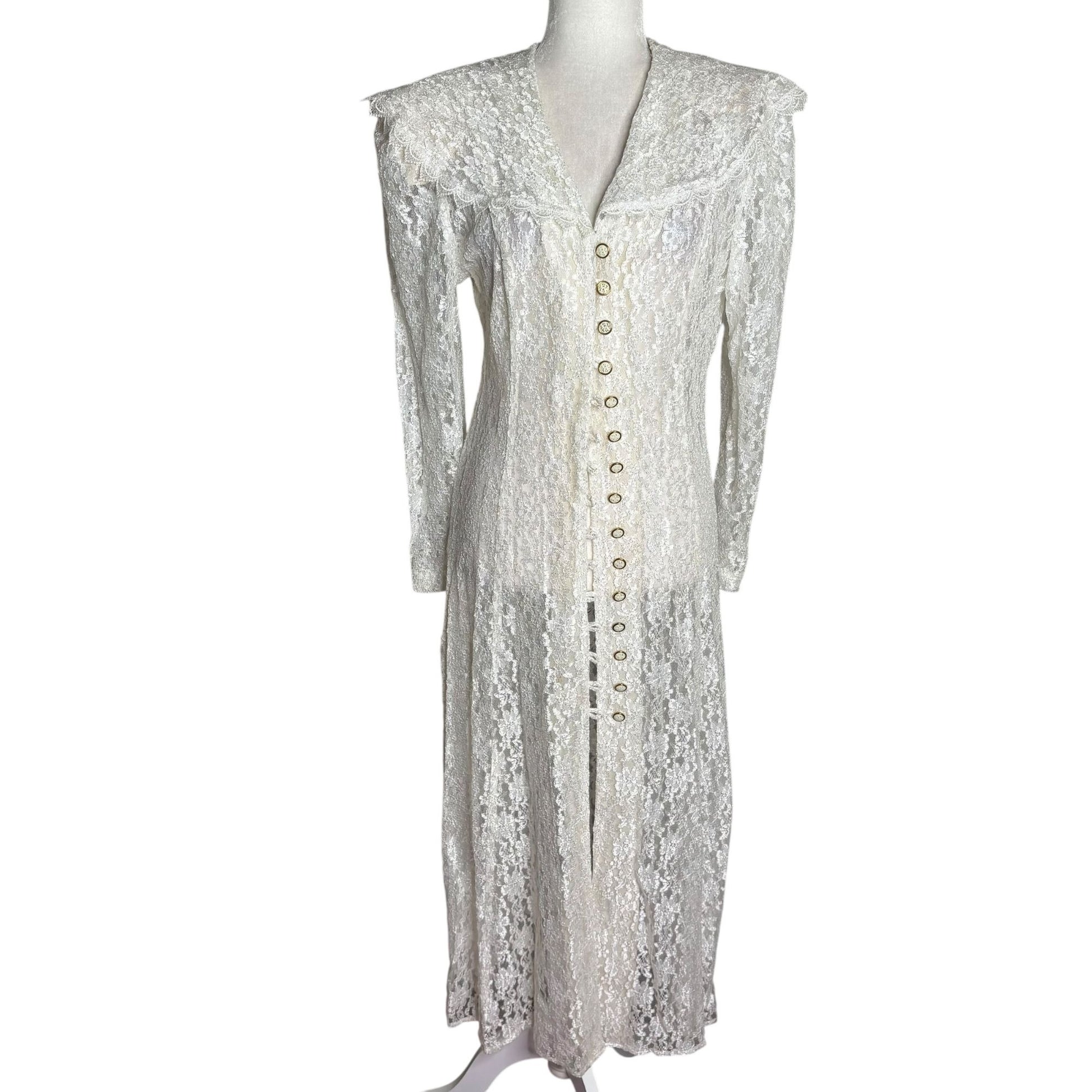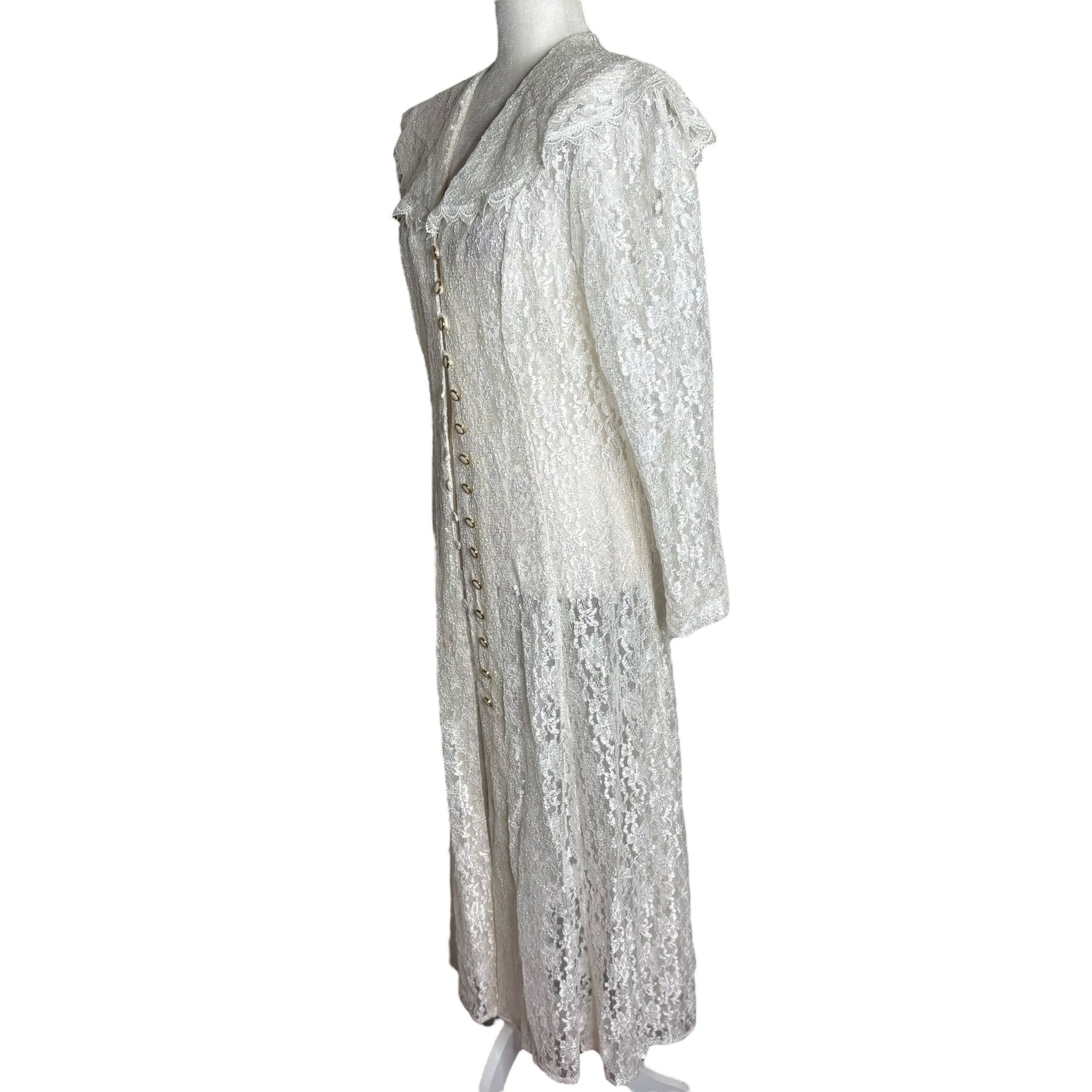 Vintage 90s Lace Button Up Maxi Dress Duster Medium White Sheer Long Sleeve