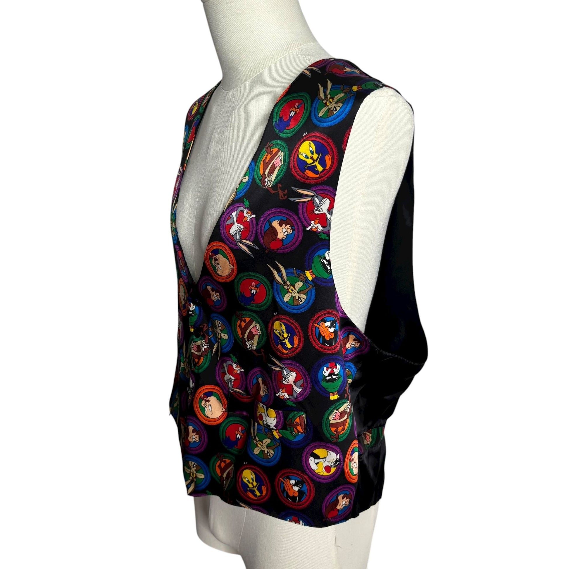 Vintage 90s Looney Tunes Mania Silk Vest Large Black Bugs Bunny Tweety Taz