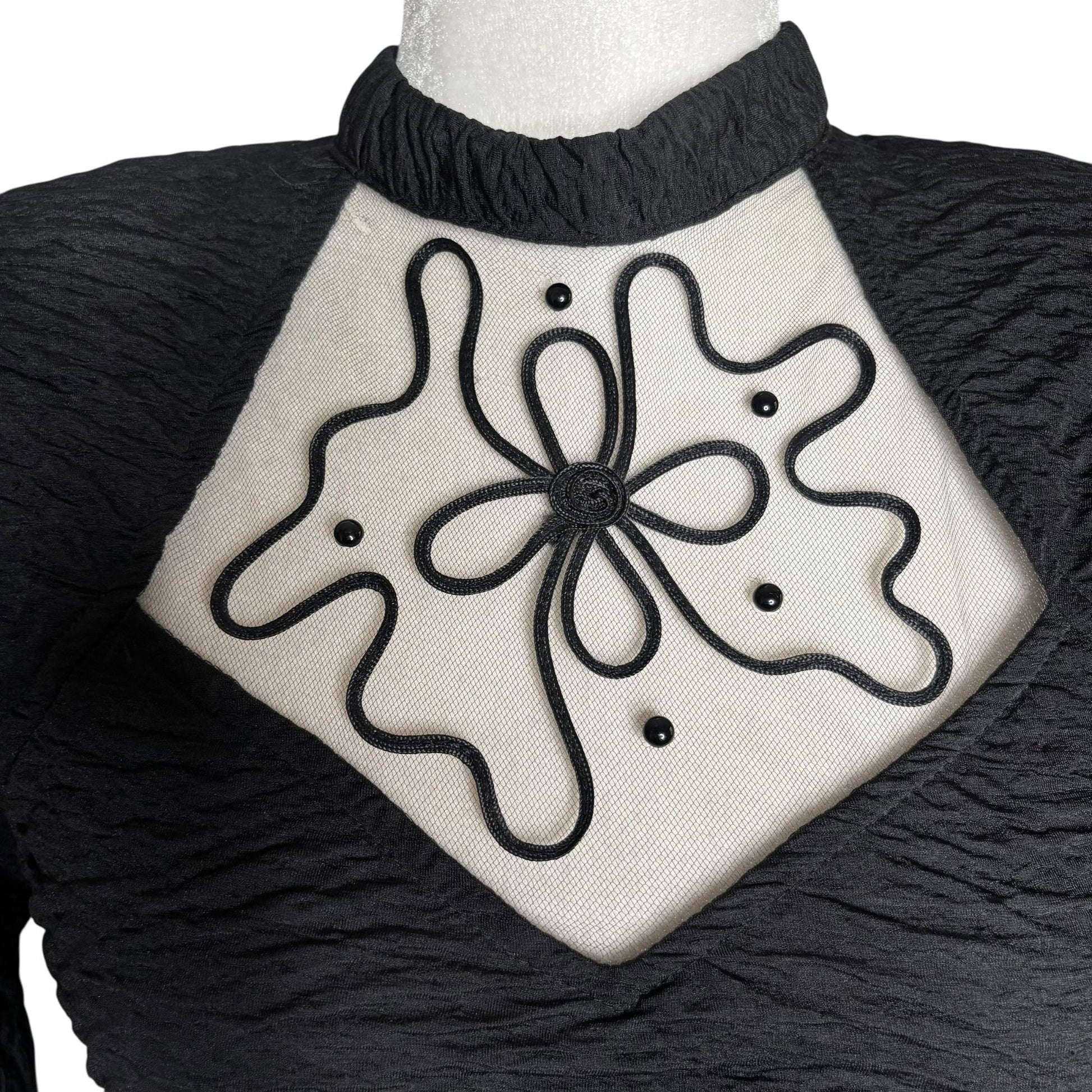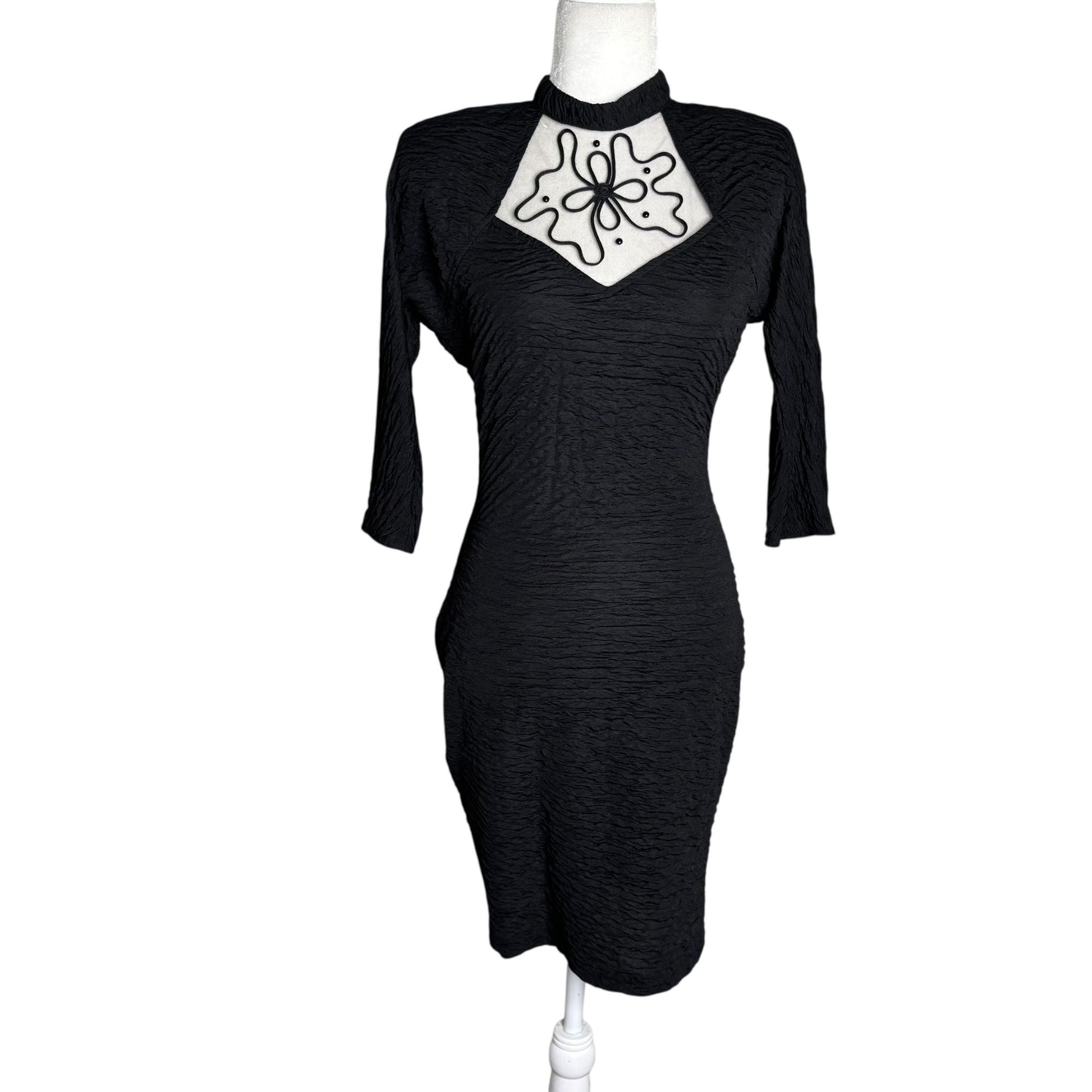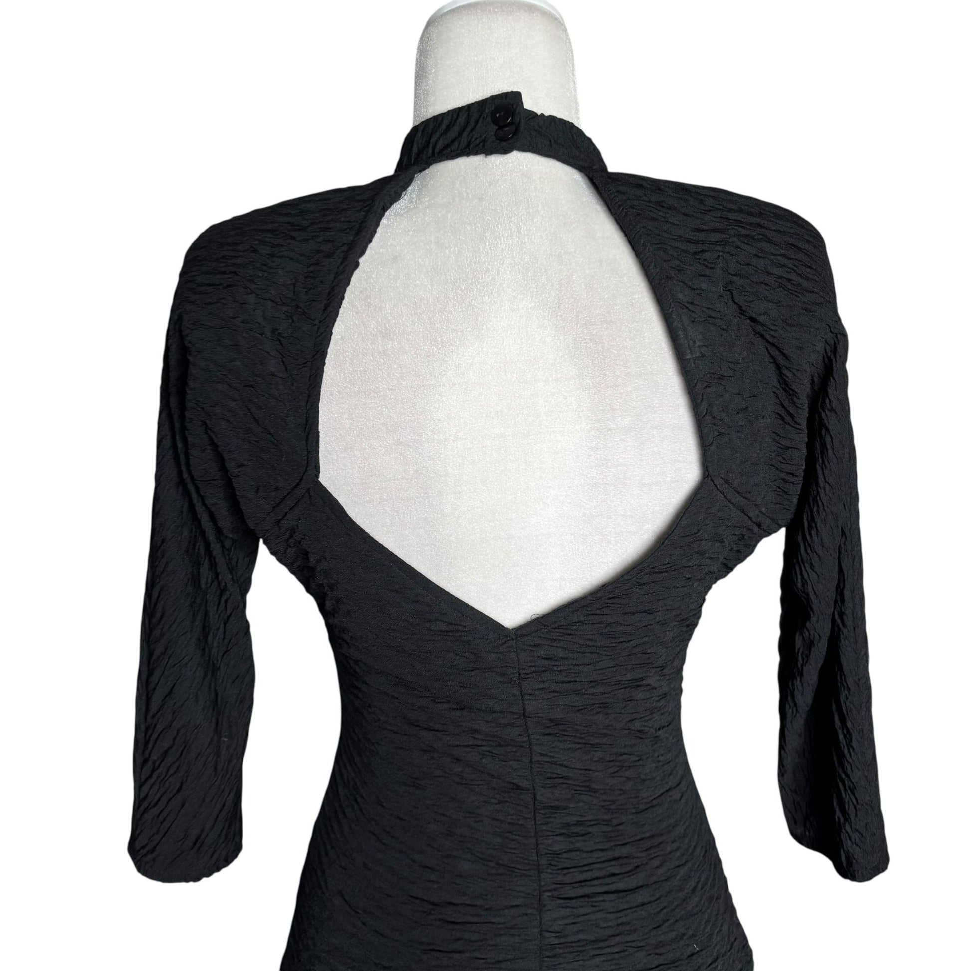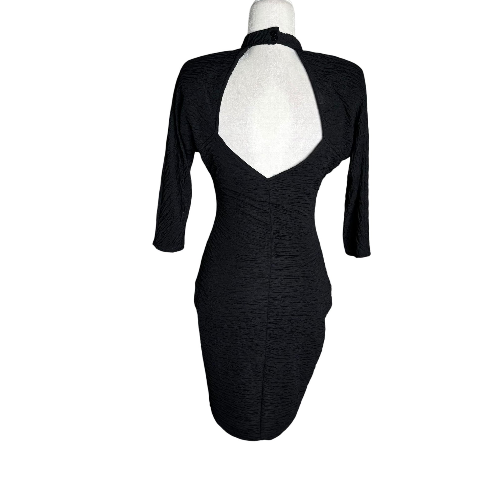 Vintage Textured Bodycon Dress Small Black Open Back 3/4 Sleeve Stretch Knit