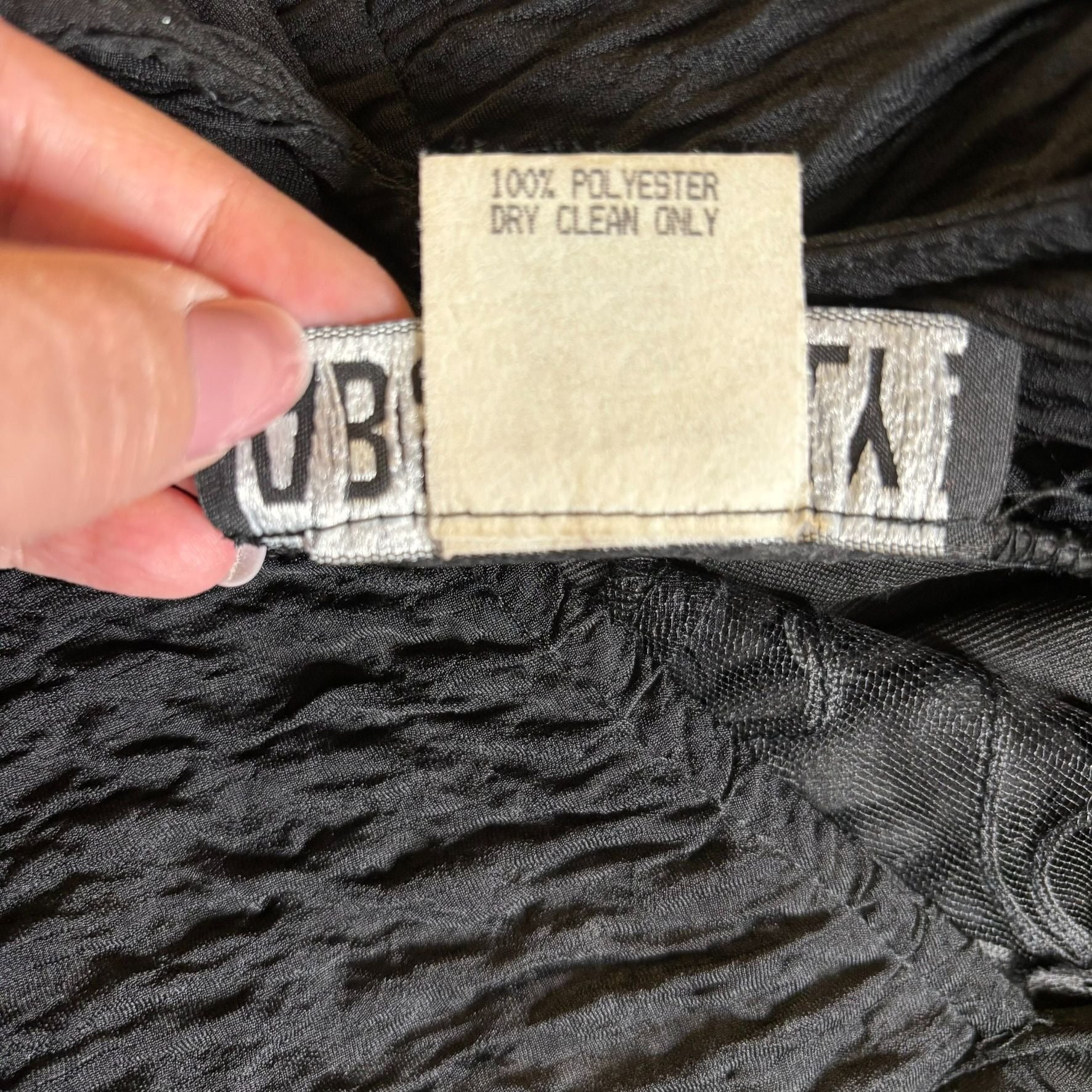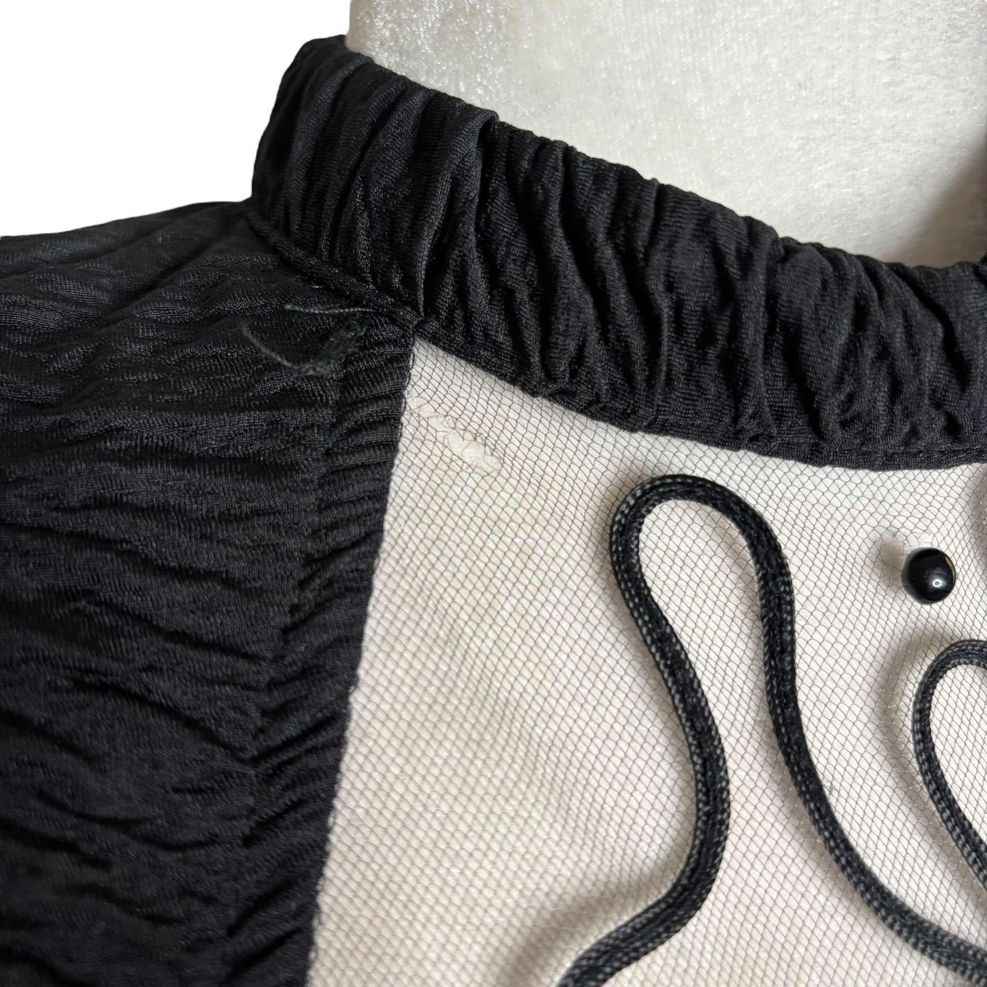 • Textured black fabric with a body-hugging fit